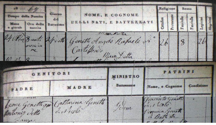 After a bit more research into Trentino history, I soon learned this “second name” was commonly used by large Tyrolean families to designate different sections of the family. It was called a sopranome or nickname. The sopranome had several purposes. It helped delineate close blood relatives so you didn’t accidentally marry your cousin, which could happen in a small, isolated community. It also identified a specific person. At any one time there could be five or six men named Giovanni Battista Genetti living within the village, as children were often named after parents, grandparents or other relatives. By adding the sopranome to the surname, one could tell the difference between Giovanni Battista Genetti Lanci and Giovanni Battista Genetti di Raina. Besides Genetti Lanci, I also found Genetti Onz, Genetti di Ovena (of Ovena) and Genetti di Raina (of Raina). These seemed to signify the main branches of the Genetti family tree.
