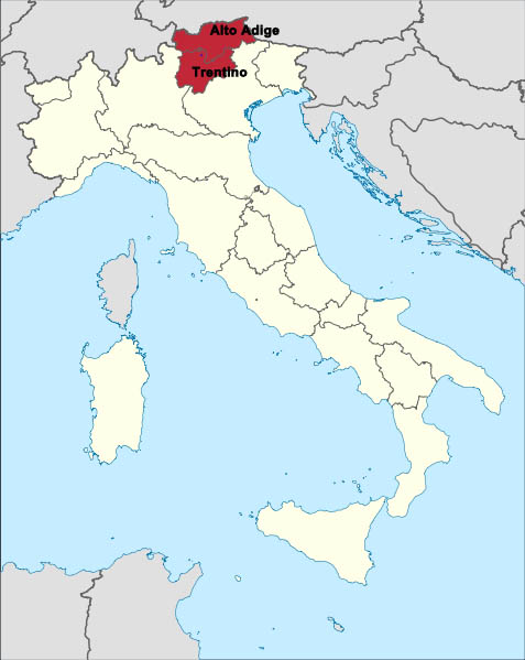 Modern Italy showing the provinces of Trentino-Alto Adige. The village of Castelfondo is located in Trentino (marked by a very small dot on the enlargement of this map!)
