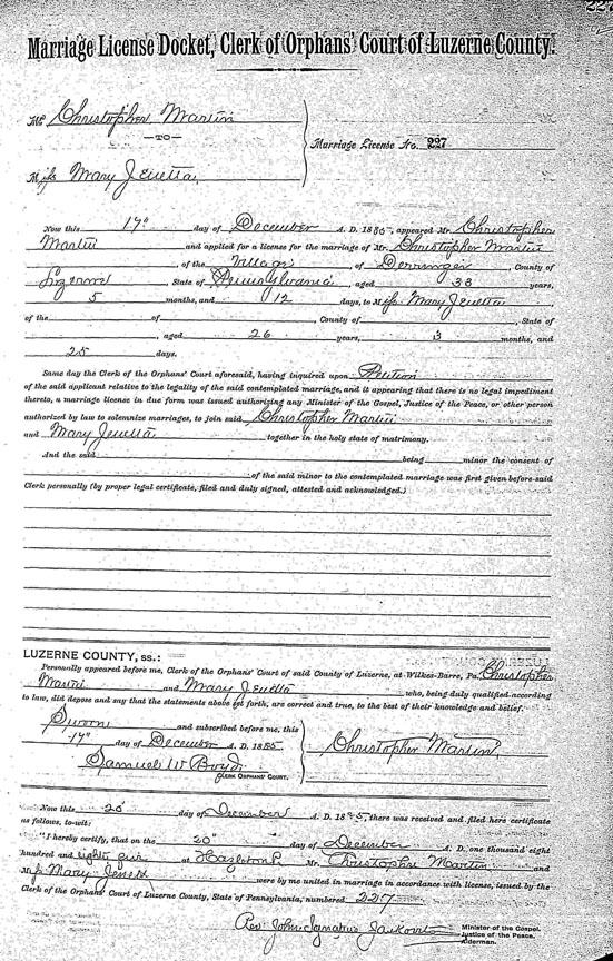 Pennsylvania marriage record for Mary Genetti to Christopher Martini, 1885. Click to enlarge.