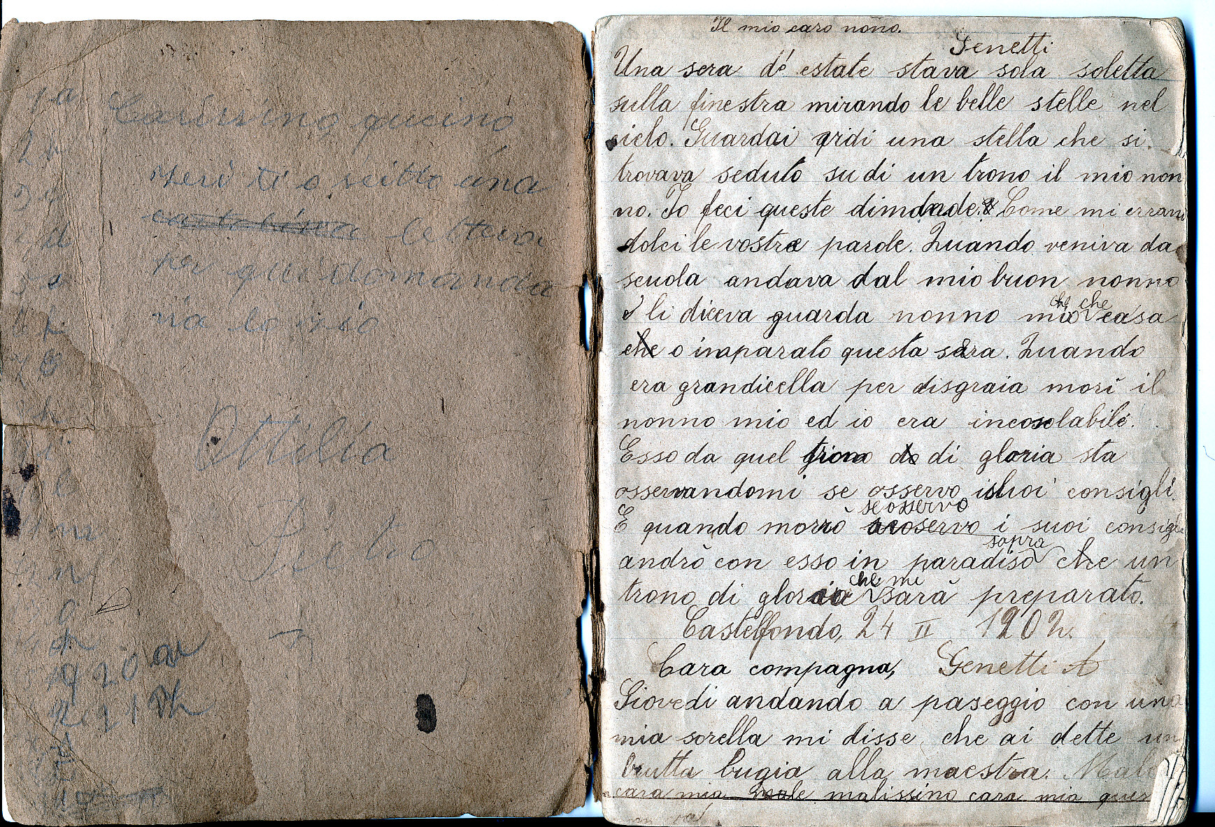 I was especially delighted to view such beautiful penmanship from a young girl. Composed in Italian (and I believe with a few words of Nones, our ancestral dialect), you can see where Tillie’s teacher has made corrections throughout the text. Also interesting to note, the title of her notebook is “Tragedy of Ottilia Genetti”.