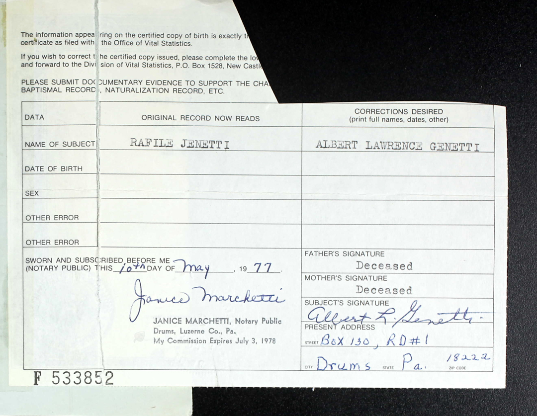 Two of the comments left on our blog were from the grandchildren of Raffaele and Lucia: Helene Prehatny and Ralph Genetti. Both thought there were eight children in the family, rather than the seven I mentioned in my original post. Although I had explained the death of the family’s oldest son, Alessandro, Ralph was sure there was another child named Raffaele Jr. who had died at birth. But Ralph had no specific information about the infant’s birth or death date or age at time of death.