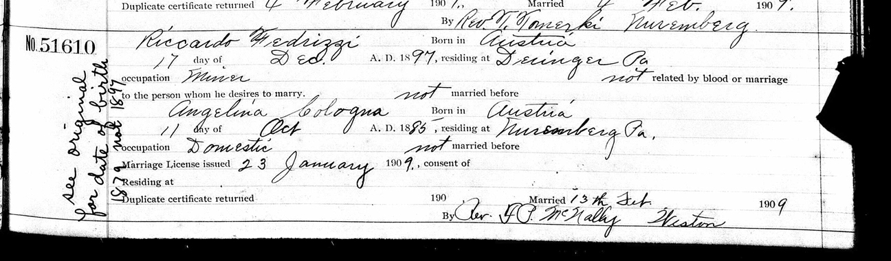 Returning to my most reliable online sources, I scoured data bases for any mention of Alessandro or Raffaele Jr. I also searched Find-A-Grave and Newspapers.com for some scrap of evidence on either child. There was nothing. I even went back into my archive from San Nicolo in Castelfondo, hoping there may be a slim chance relatives of Raffaele or Lucia had notified the village priest of a family birth in Hazleton. (If the couple had relatives still living in Castelfondo and they had kept a close connection with family, sometimes you will find a birth in the United States included in the church’s baptismal records.) Unfortunately, once again I came up empty. There was simply no paper trail left for either infant.