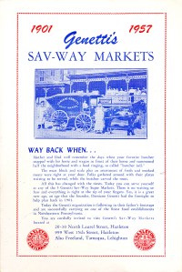 My last upload was found by accident when it was posted to a Facebook group about Hazleton. It is an advertising brochure for the Genetti markets and the Tyrolean Room to celebrate Hazleton’s Centennial in 1957. Nicole V. Cook, owner of a shop in Hal’s Antique Flea Market in Sybertsville, PA, had posted the image. I sent Nicole a message inquiring if the brochure was for sale. It was and a short time later it arrived in my mailbox. Many thanks to Nicole! She is now on the look-out for other Genetti items that may end up in her shop. Click here to read: Genetti 1957 Centennial Brochure
