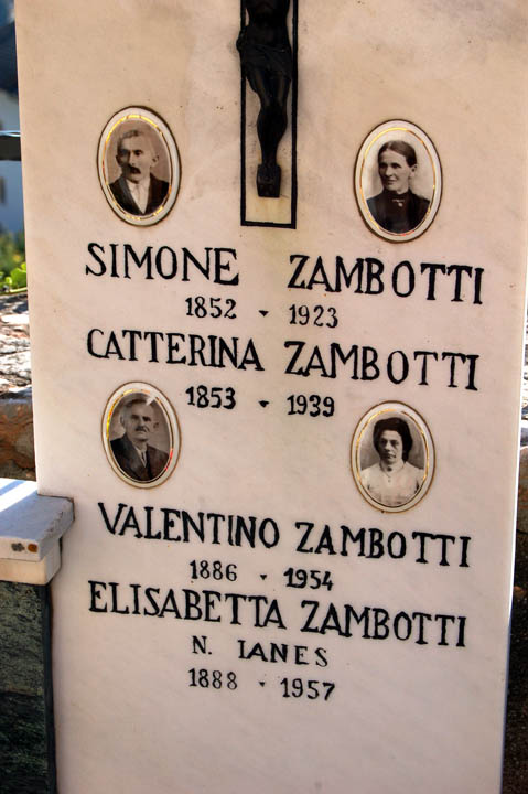 Simone and Catterina were the parents of Alessandro and Pietro Zambotti. (San Nicolo Cemetery in Castelfondo – marker no longer in cemetery)