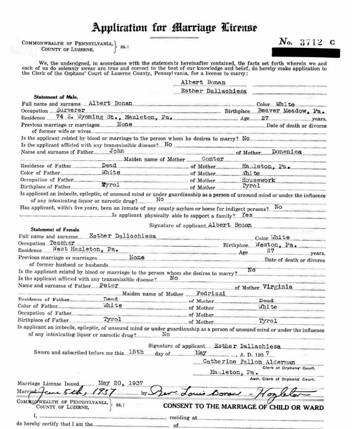 Their oldest child, Esther Olivia, married Albert Bonan in 1937 at Our Lady of Mount Carmel Tyrolese Church in Hazleton, PA. Soon after the couple moved to Maryland and had six children. Esther was a school teacher prior to her marriage to Albert. Sadly, like her parents, Esther also passed away at the young age of 52.