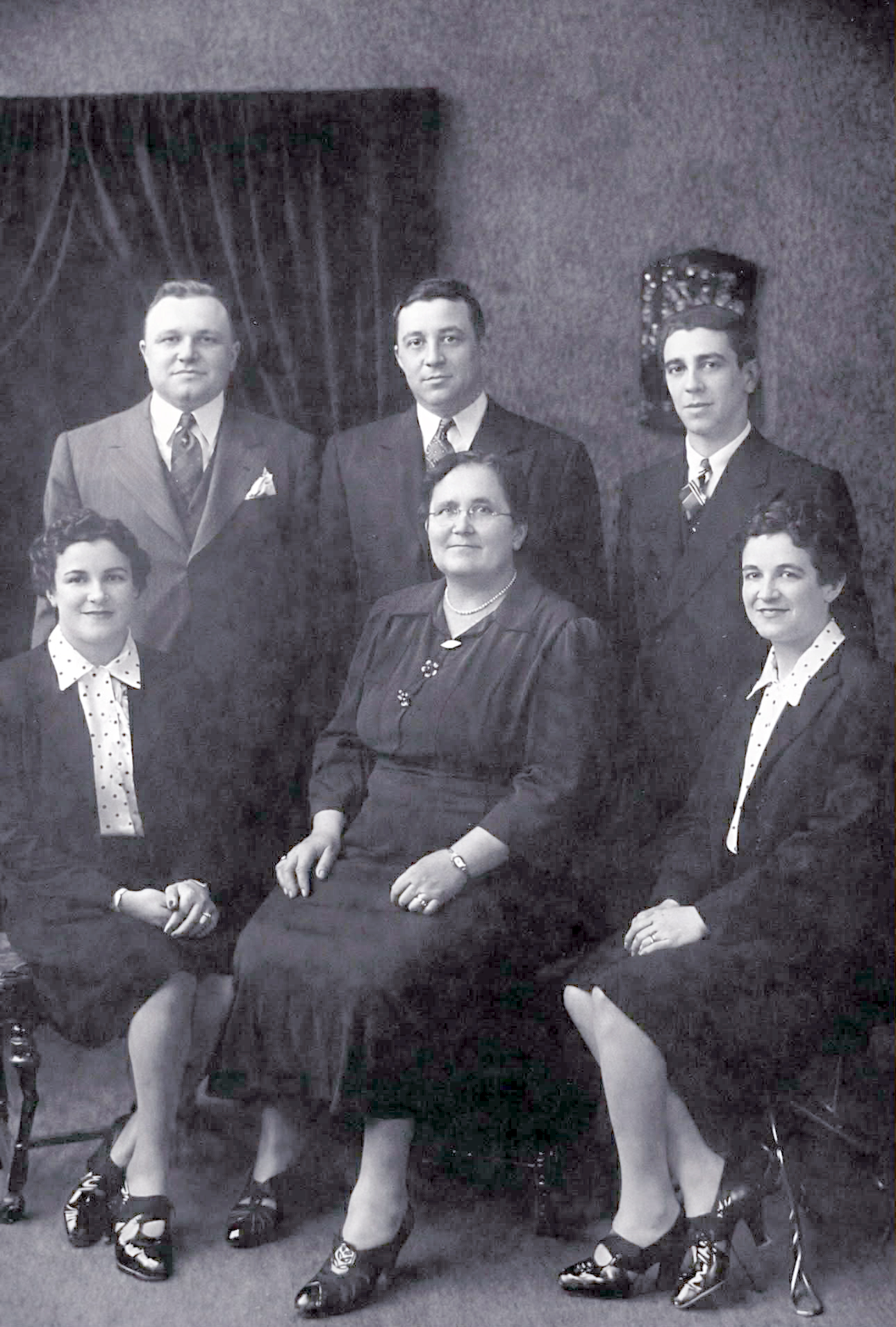 Vigilio Genetti (1852-1932) married a second time in 1915 after the death of his first wife, Maria, in 1907. He and widow, Margaretha Mueller Kittstein (1882-1956), had three children together. The large blended family also included Margaretha’s two sons from her previous marriage and four children from Vigilio’s first marriage. Photograph dates to 1937. Back row standing: Stepsons Fred and George Kittstein, Vernon Genetti. Front row seated: Marguerita (Margaret) Maria Genetti, mother Margaretha Mueller Kittstein, Rosina Amelia Genetti. (Margaret and Amelia were twins.)