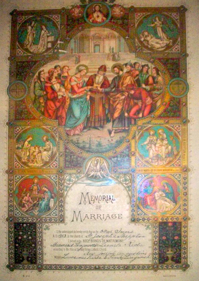 This beautiful memorial commemorated the marriage of Bernard Thomas Lingousky to Leonela Erminia Recla on June 30th, 1913.