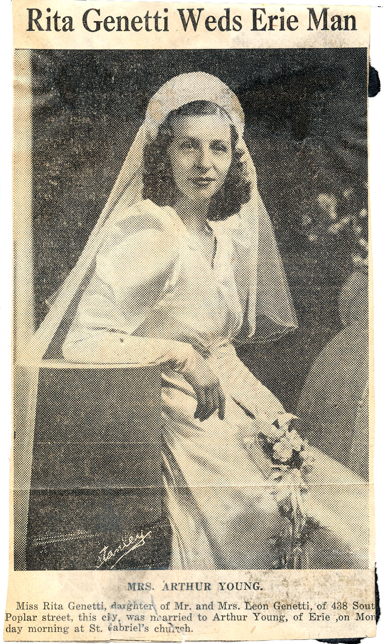 The announcement reads: Miss Rita Genetti, daughter of Mr. and Mrs. Leon Genetti, of 438 South Poplar street, this city, was married to Arthur Young, of Erie, on Monday morning at St. Gabriel’s church.