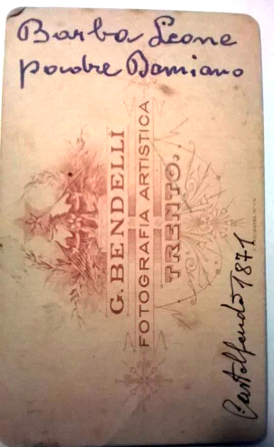 The back of Leone’s cabinet card uses the dialect of Nonnes. It reads “Uncle Leone, father of Damiano, Castelfondo 1871.” The portrait was taken by G. Gendelli Fotografia Artistica located in the city of Trento. From the inscription, the card was originally intended as a gift to one of Leone’s siblings, eventually saved by a niece or nephew who added the caption. Note that the the two inscriptions are in different styles of handwriting and different ink colors, indicating they were written by different people at different times.