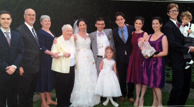 The entire Daly family at the wedding of Jean’s granddaughter, Jeanne, 2014. Photo includes three great-grandchildren (Beatrice, Aurelia, and Edmund). L to R: Ian (Barbara’s husband), Chris, Barbara, Jean, Jeanne (bride), Jon Leaman (groom), Luke, Cecelia, Catherine and Aurelia, Catherine’s husband, Joe Feil, and Ned.